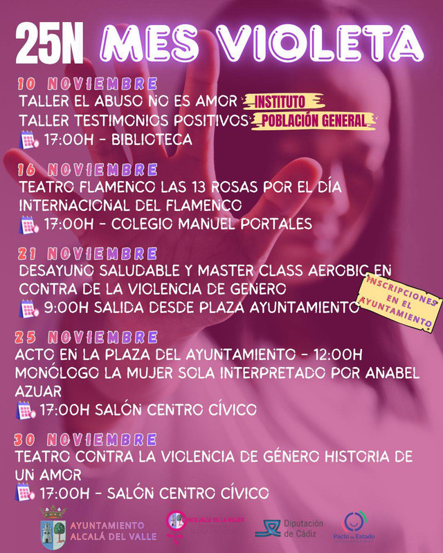 Durante este mes de noviembre, desde el Ayuntamiento de Alcalá del Valle y la Concejalía de la Mujer, hemos preparado diversas actividades para conmemorar el Día Internacional para la Eliminación de la Violencia contra la Mujer.