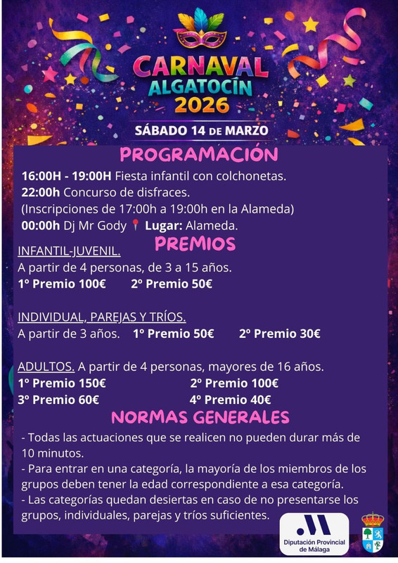 El próximo sábado 14 de marzo, la localidad de Algatocín celebrará su esperado Carnaval, una jornada llena de color, música y diversión para todas las edades. El epicentro de la fiesta será la Alameda, donde se desarrollarán las principales actividades y concursos.