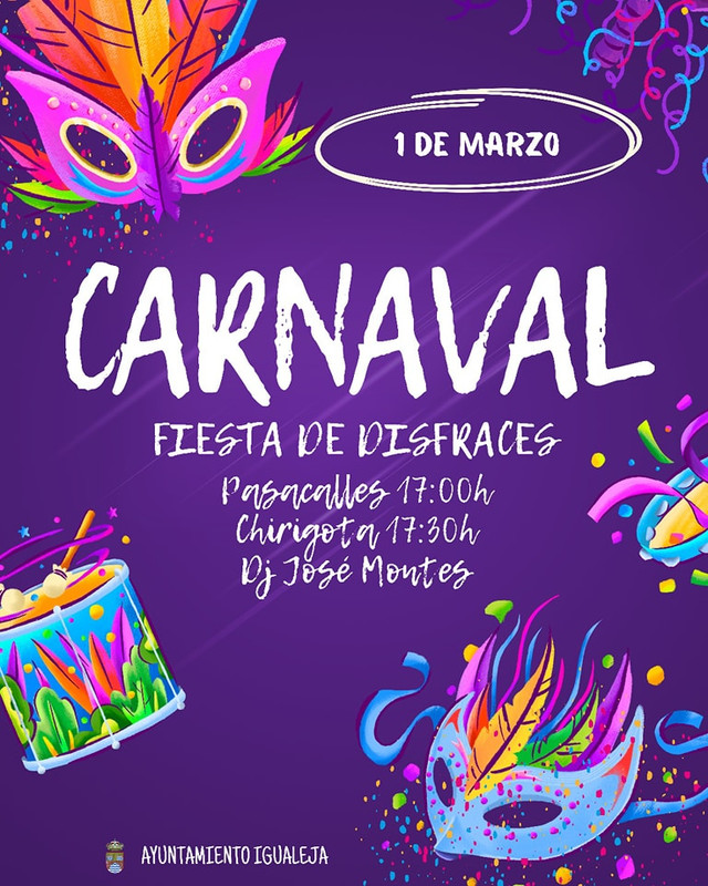 El próximo Sábado 1 de Marzo disfrutaremos del Carnaval en Igualeja, dando comienzo a las 17:00 el pasacalles que saldrá desde el Barrero.