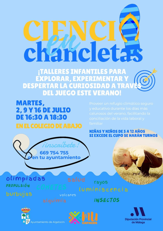Este verano, el Ayuntamiento de Algatocín y la Diputación Provincial de Málaga invitan a todos los niños y niñas de 5 a 12 años a participar en los emocionantes talleres "Ciencia en Chancletas". Diseñados para despertar la curiosidad y el amor por la ciencia a través del juego, estos talleres ofrecen una oportunidad única para aprender y divertirse al mismo tiempo.