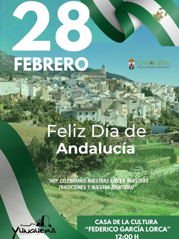 El Ayuntamiento de Yunquera invita a vecinos y visitantes a asistir al acto institucional del Día de Andalucía, el 28 de febrero a las 12:00 h en la Casa de la Cultura “Federico García Lorca”.