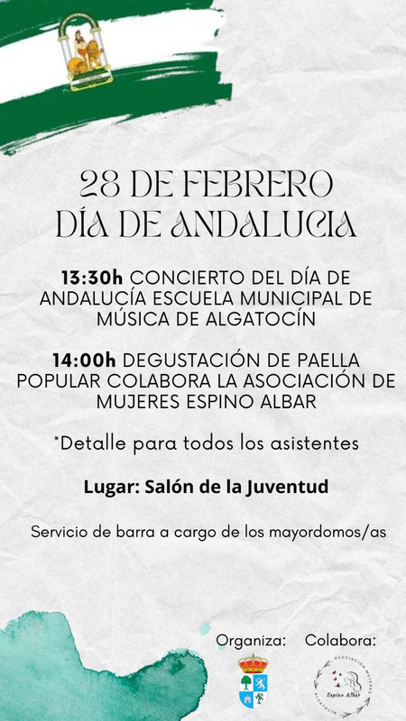 Este viernes 28 de febrero, te invitamos en el Salón de la Juventud, al concierto del Día de Andalucía ofrecido por la Escuela de Municipal de Música de Algatocín y posterior degustación de paella popular elaborada por la Asociación de Mujeres Espino Albar.