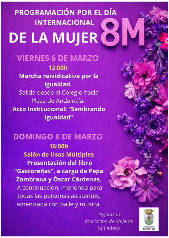 Os invitamos a participar en la marcha por la igualdad, el acto institucional “Sembrando Igualdad” y en la presentación del libro “Gastoreñas”, que irá acompañada de una merienda y música de las décadas de los 60, 70 y 80.
