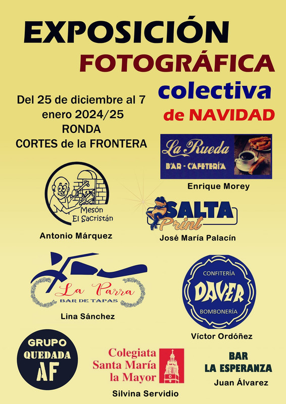 Un año más, GRUPO QUEDADA AF muestra al público durante las fiestas navideñas una colección de fotografías que lucirán en diferentes negocios de nuestra ciudad, Ronda y también en su Serranía siendo Cortes de la Frontera y la Estación de Cortes los lugares elegidos por los fotógrafos participantes. Durante los días que están las fotografías expuestas haremos visitas guiadas con sus autores por si os animáis a acompañarnos.