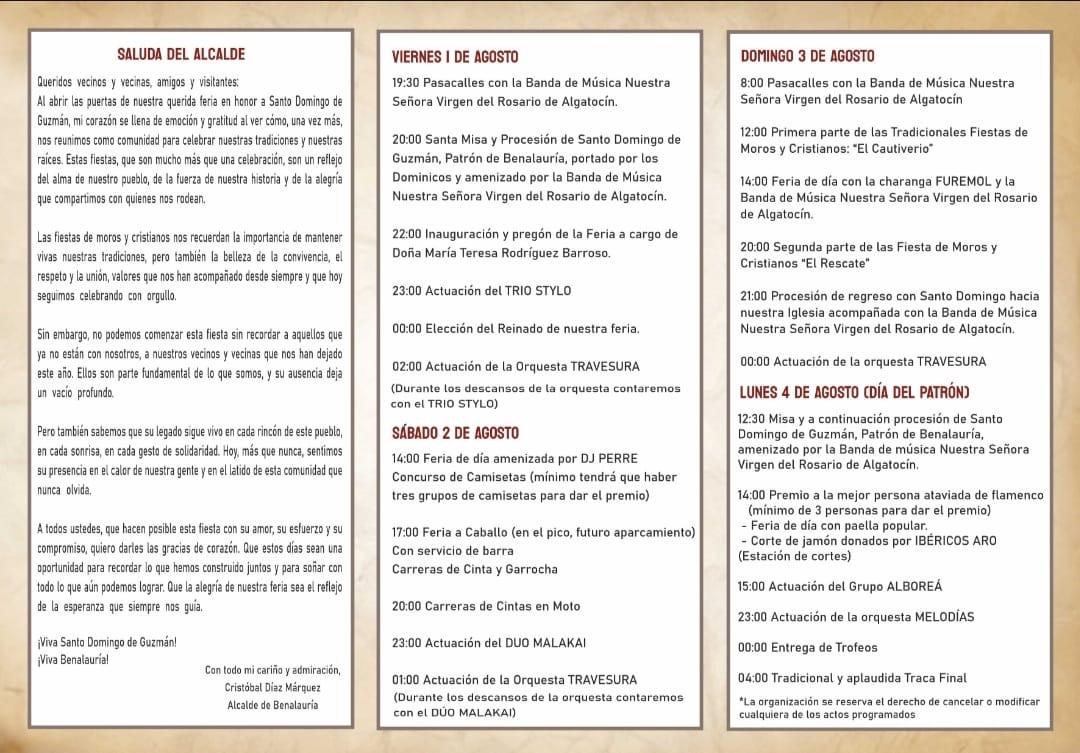 - 12:30 Misa y a continuación procesión de Santo Domingo de Guzmán, Patrón de Benalauría, amenizado por la Banda de música Nuestra Señora Virgen del Rosario de Algatocín.