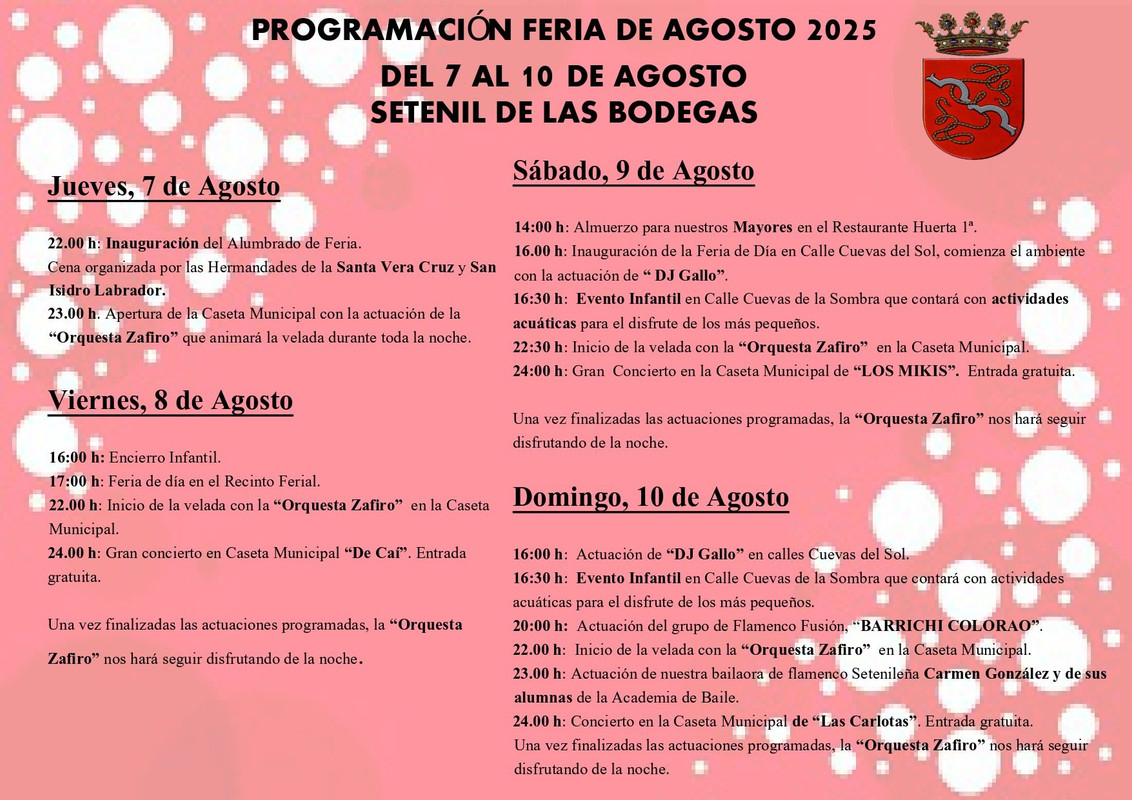 - 23.00 h: Actuación de nuestra bailaora de flamenco Setenileña Carmen González y de sus alumnas de la Academia de Baile.