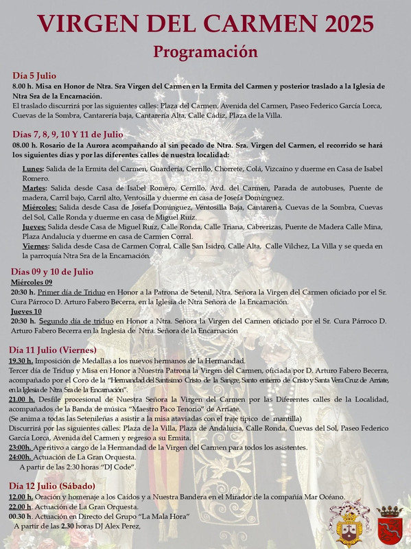 - 08.00 h. Rosario de la Aurora acompañando al sin pecado de Ntra. Sra. Virgen del Carmen, el recorrido se hará los siguientes dias y por las diferentes calles de nuestra localidad: