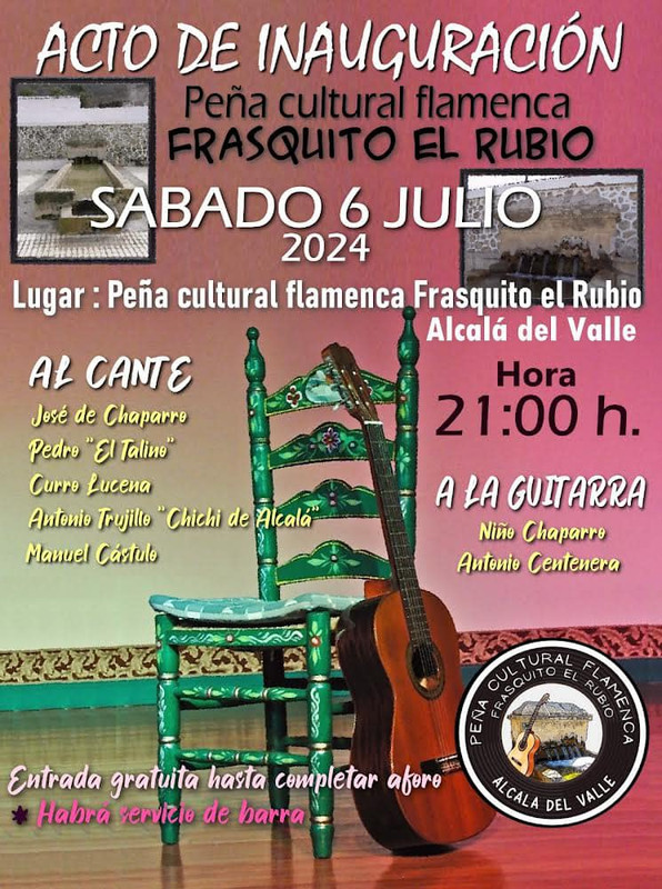 El próximo sábado 6 de julio de 2024, a las 21:00 horas, Alcalá del Valle se vestirá de gala para la esperada inauguración de la Peña Cultural Flamenca "Frasquito El Rubio". Este evento promete ser una noche inolvidable llena de arte, pasión y tradición, y se llevará a cabo en la sede de la peña flamenca ubicada en la localidad.