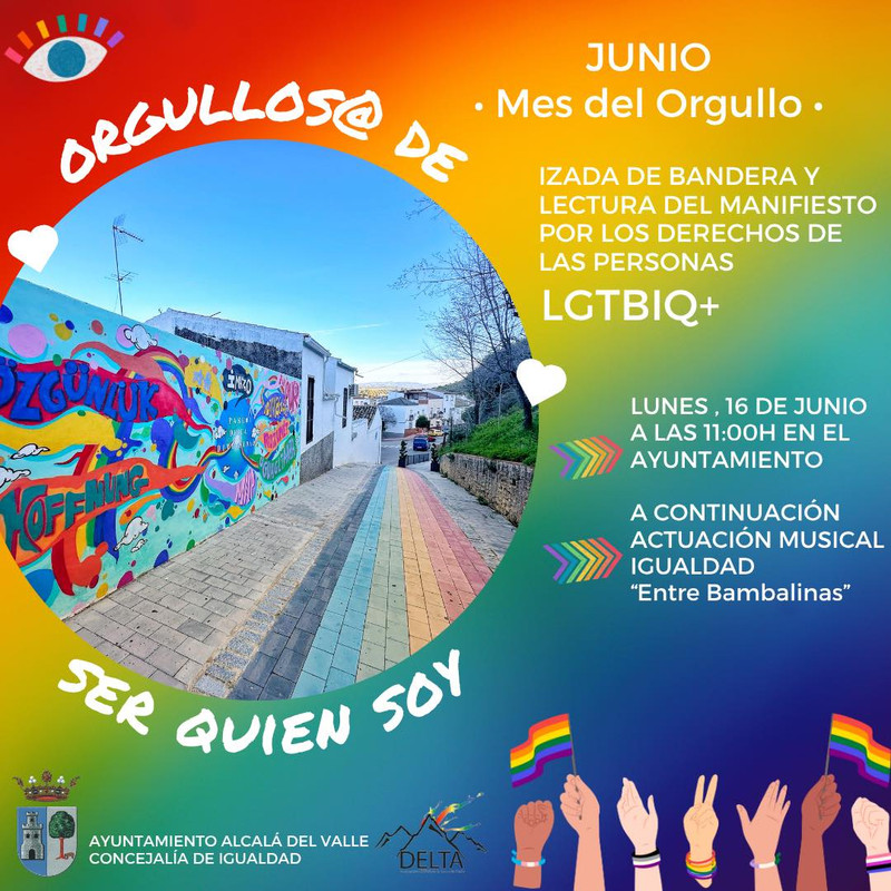 Acompáñanos este lunes 16 de junio a las 11:00h en el Ayuntamiento para la izada de bandera y lectura del manifiesto por los derechos de las personas LGTBIQ+.