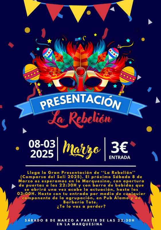El Ayuntamiento de Cortes de la Frontera informa de que llega la Gran Presentación de "La Rebelión" (Comparsa del Seli 2025). El próximo Sábado 8 de Marzo os esperamos en la Marquesina, con apertura de puertas a las 22:30H y con barra de bebidas que se abrirá una vez acabe la actuación, hasta las 03:00H. Hazte con tu entrada por medio de cualquier componente de la agrupación, en Pub Álamo y en Barbería Tote.