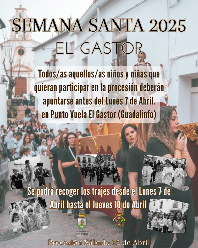 El sábado 12 de Abril a las 18:00H se celebrará la procesión infantil que organiza “Esperanza Tres Caídas El Gastor” junto a nuestra Ludoteca Municipal, Punto Vuela El Gastor y todos los niños y niñas que quieran participar.