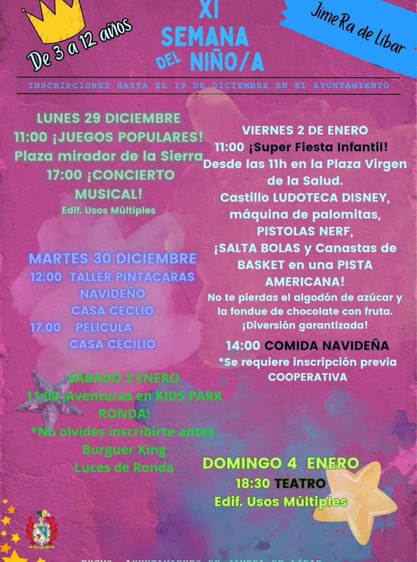 La XI Semana del Niño de Jimera de Líbar ofrece una programación variada para niños de 3 a 12 años, con inscripciones abiertas hasta el 20 de diciembre en el Ayuntamiento. Las actividades tendrán lugar entre el 29 de diciembre de 2025 y el 4 de enero de 2026, y muchas requieren inscripción previa. A continuación, se detalla el calendario de eventos: