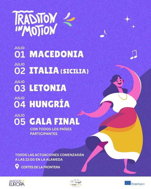 Cada país tendrá una noche dedicada exclusivamente a mostrar su cultura, tradiciones y bailes típicos. Las actuaciones comenzarán el 1 de julio y se celebrarán cada noche a las 22:00, en Cortes de la Frontera.