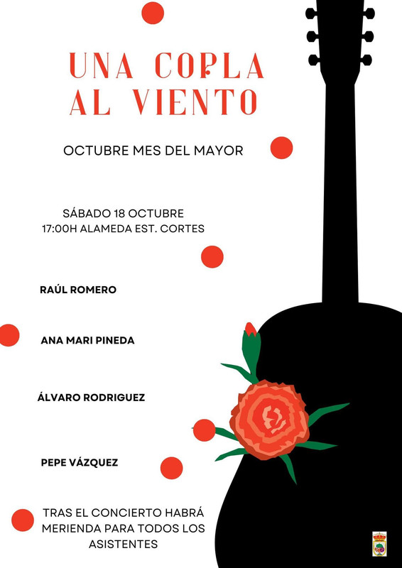 El próximo día 18 de octubre, sábado, aprovechando que estamos en el MES DEL MAYOR, tendremos el concierto que se aplazó en Semana cultural: UNA COPLA AL AIRE, coplas cantadas por vecinos y vecinas de Cortes y Estación de Cortes. Se celebrará en la Alameda de la Estación de Cortes a las 17:00h y después habrá una merienda para todos los asistentes a cargo del Ayuntamiento. Esperamos que nos acompañéis.
