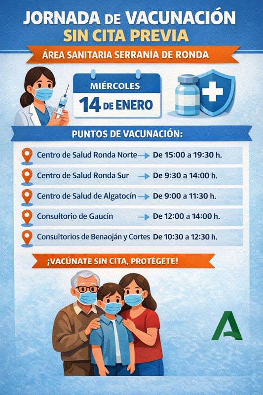 El miércoles 14 de enero tendrás la oportunidad de vacunarte contra la gripe y la Covid sin cita previa en Ronda. El punto habilitado será el Círculo de Artistas. Una ocasión perfecta para protegerte y proteger a quienes te rodean.