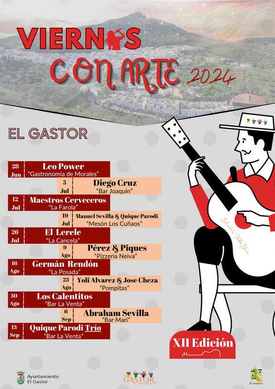 Os presentamos el cartel del XII ciclo "Viernes con Arte" El Gastor 2024, programación artísticas, que se llevará a cabo cada viernes desde el próximo día 28 de junio hasta el 13 de septiembre.